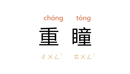 ⒊ 代称虞舜或项羽。(1)代称舜。唐李白《远别离》诗:“或言尧幽囚,舜野死,九疑连绵皆相似,重瞳孤坟竟何是。”清厉鹗《一半儿·上虞百官江口舜庙》曲:“重瞳此地有遗苗,野庙空江玉座销。”(2)代称项羽。清钱谦益《徐州杂题》诗之二:“重瞳遗迹已冥冥,戏马台前鬼火青。十丈黄楼临泗水,行人犹说霸王厅。”清周龙藻《大墙上蒿行》:“亚父好竒策,终被重瞳误。”(3)比喻像舜一样的圣明天子。宋文莹《玉壶清话》卷四:“﹝杨大年﹞以诗贻馆中诸公曰:'闻戴宫花满鬓红,上林丝管侍重瞳。'”明邵璨《香囊记·琼林》:“三策献重瞳,独占鳌头圣恩重。”