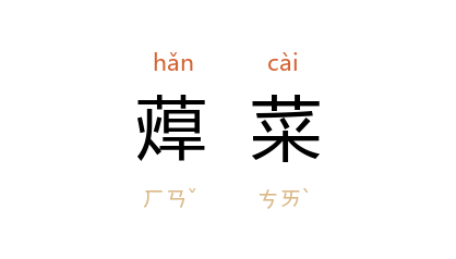 ⒈ 植物名。十字花科蔊菜属,多年生草本。生于田地及庭园,茎高二、三寸至一、二尺,叶长椭圆形,羽状分裂或不分裂,叶缘有不齐之缺刻。春季开花,总状花序,色黄。果实为细长干果,呈线状,熟则裂开。茎与叶皆辛辣,可供食用。