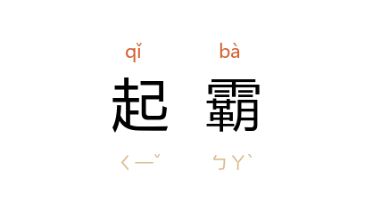 ⒈ 起而称霸。戏曲表演中程式之一。即武将上阵前所做的整盔、束甲等一套舞蹈动作。据说始用于明代传奇《千金记·起霸》。京剧《霸王遇虞姬》第一场:“司马欣、董翳、李由、孙胜、章平、周熊、王离、韩章上,起霸。”京剧《取南郡》第六场:“牛金上,起霸。”