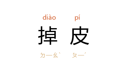 引《白雪遗音·银纽丝·两亲家顶嘴》:“撒谎掉皮他的胆大,那世里遭逢这恶寃家。”孙锦标 《通俗常言疏证·年齿》:“扬子 《方言》:‘傜陂,衺也。’今谓欺诈曰‘掉皮’,即‘傜陂’也。今俗以小儿狡獪无赖者,或曰‘顽皮’,或曰‘掉皮’是也。”
