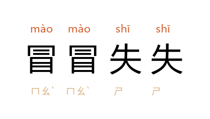 引《红楼梦·第五一回》:「若冒冒失失一嚷,倒闹起人来。」《老残游记二编·第三回》:「人说什么马褂子颜色好,花样新鲜,冒冒失失的就问。」
