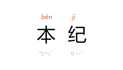 ⒊ 史书记帝王之事,称为「本纪」。其例始于《史记》。