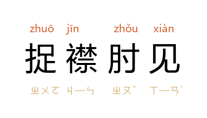 引《庄子·让王》:「十年不制衣,正冠而缨绝,捉衿而肘见。」《歧路灯·第七七回》:「只为一向窘迫,捉襟肘见,便东涂西抹不来,所以诸事胆怯。」