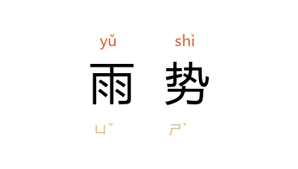 引唐 无可 《送杜司马再游蜀中》诗:“日光低峡口,雨势出蛾眉。”宋 陆游 《卯饮醉卧枕上有赋》:“雨势平吞野,风声倒卷江。”元 孟汉卿 《魔合罗》第一折:“云气深如倒悬着东大海,雨势大似翻合了 洞庭湖。”清 厉鹗 《秋雨杂述》诗之二:“秋气衣裳单,雨势暮尤急。”