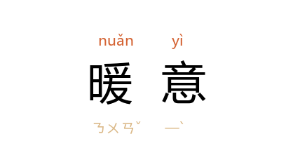 引瞿秋白 《赤都心史》三七:“厅中竖着一棵大杉树,上插小烛,融融火光,满室都含温情的暖意。”郭沫若 《双倍的春天》诗序:“在欢迎队伍中,车行很缓,暖意盎然,社会主义的春天有了加倍的感觉,因成此诗。”