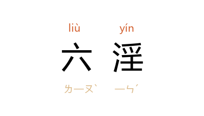 英语(TCM) six excesses causing illness, namely: excessive wind 風|风[feng1], cold 寒[han2], heat 暑[shu3], damp 濕|湿[shi1], dryness 燥[zao4], fire 火[huo3]