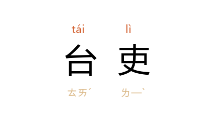 引《晋书·戴洋传》:“﹝ 戴洋 ﹞好道术,妙解占候卜数, 吴 末为臺吏,知 吴 将亡,託病不仕。”宋 周密 《齐东野语·洪君畴》:“谓内司争田伐木词讼,皆臺吏受贿以强察官之判,所以上罔圣听。”《宋史·李昉传》:“二年陪祀南郊,礼毕,入贺,因拜舞仆地,臺吏掖之以出。”