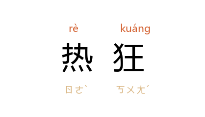 引郭沫若 《北伐途次》二七:“这一个消息,和公开这个消息的奇妙的手段,把在热狂中还未镇静的民众和市民愈见煽扬了起来。”茅盾 《子夜》十七:“发展实业的热狂已经在他血管中冷却!”
