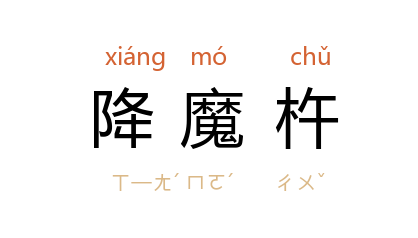 引《宋史·呼延赞传》:“及作破阵刀、降魔杵;铁折上巾,两旁有刃,皆重十数斤。”《西游记》第四二回:“那 木叉 按下云头,将降魔杵,如筑墻一般,筑了有千百餘下。”清 李斗 《扬州画舫录·新城北录中》:“八大刹佛作,媲美 苏州。而 重寧寺 佛作,则照内工做法……如华盖、琵琶、佛魔杵、九环锡杖。”