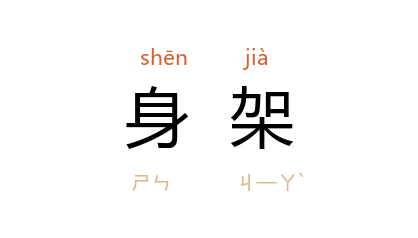引康濯 《春种秋收·故事》:“那小伙子呀!身架儿就像画上的狮子,肚里头墨水也满多!”甘征文 《任弼时·东进抗日前线》:“他脸庞瘦削,身架精悍。”