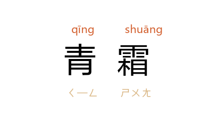 ⒈ 青白色的霜;秋霜。一说司霜之神为青女,故名。