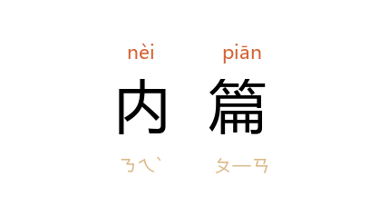⒈ 古代指论着中的主要部分,对“外篇”而言。如《庄子》、《晏子春秋》、《抱朴子》、《史通》、《文史通义》等书都分内、外篇。内篇为作者要旨所在,外篇则属馀论或附论性质。又文集亦有分内外篇者,内篇多为作者自编或有关学术义理的文章,如汪中《述学》。《晋书·葛洪传》:“故予所著子,言黄白之事,名曰内篇。其余驳难通释,名曰外篇。”唐成玄英《〈庄子〉序》:“《内篇》明于理本,《外篇》语其事迹,《杂篇》杂明于理事。”后以内篇指神仙家言。