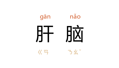引汉 司马相如 《喻巴蜀檄》:“是以贤人君子,肝脑涂中原,膏液润野草而不辞也。”宋 王安石 《吾心》诗:“初闻守善死,颇復吝肝脑。”清 黄宗羲 《明夷待访录·原君》:“是以其未得之也,屠毒天下之肝脑,离散天下之子女,以博我一人之产业,曾不惨然。”邹鲁 《中国国民党史稿》第一篇:“当此千钧一髮之时,则冒锋鏑、捐肝脑为前躯,以争其最后者,捨吾党其谁属?”