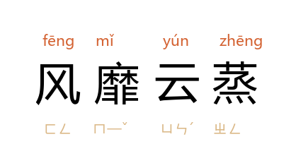 ⒈ 比喻事物风行的快而迅速。南朝梁·钟嵘〈诗品序〉:「况八纮既奄,风靡云蒸,抱玉者联肩,握珠者踵武。」也作「风靡云涌」。