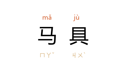 ⒈ 在马身上配备的器具、物品,如马鞍子、马蹬等,供骑马用。