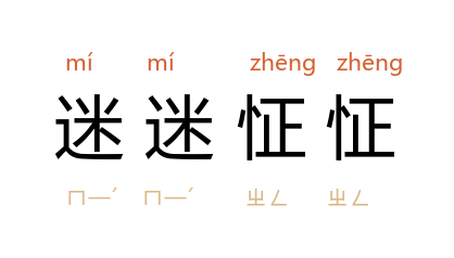 引朱老忠 还是迷迷怔怔,当他出外的时候,正比 大贵 小一点,比 二贵 大一点。”梁斌 《红旗谱》二四:“忠大伯 迷迷怔怔地蹲在炕头上,不吃饭也不说话,抱着脑袋趴在膝头上,昏昏迷迷地睡了一觉。”