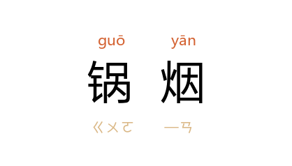 引沙汀 《丁跛公》:“十多个脸上涂着锅烟,头上插着油纸枚子的汉子,冲进来了。”耿简 《爬在旗杆上的人》:“石灰刷个白地子,用锅烟子写标语。”