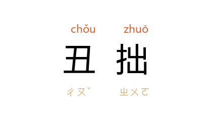 引北齐 颜之推 《颜氏家训·文章》:“吾见世人,至无才思,自谓清华,流布丑拙,亦以众矣。”唐 张鷟 《游仙窟》:“下官遂作而谢曰:‘沧海之中难为水,霹靂之后难为雷。不敢推辞,定为丑拙。’”明 蒋一葵 《长安客话·碧云寺》:“卓锡泉 傍一柳纍纍若负癭,形甚丑拙,众呼癭柳。”