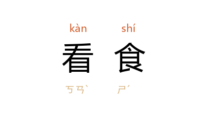 引宋 周密 《武林旧事·皇后归谒家庙》:“初坐:皇后,下酒吃食九盏,上细看食十件,果子意思十件。”清 平步青 《霞外攟屑·释谚·看桌》:“越 人呼 满 汉 酒席为喫桌、看桌。考 唐 人谓之看食。 《南部新书》壬:‘御厨进饌,凡器用由少府监进者,九飣食,以牙盘九枚,装食味其间,置上前。亦谓之看食。’”