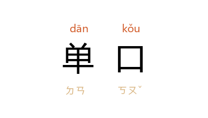 ⒈ 曲艺的一种表演形式。指由一个演员进行表演。许多曲种均为单口,如京韵大鼓、山东快书等。有些曲种有多种表演形式,其一人表演的则称单口,如单口相声、单口快板。