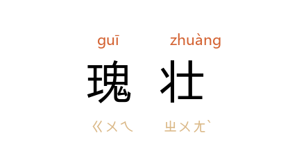 引《西京杂记》卷六:“﹝ 晋灵公 冢﹞甚瑰壮,四角皆以石为玃犬捧烛。”《艺文类聚》卷八三引 南朝 宋 刘义庆 《幽明录》:“人见一金牛,形甚瑰壮,以金为繅绊。”唐 张彦远 《历代名画记·朱审》:“﹝ 朱审 ﹞工画山水,深沉瓌壮。”