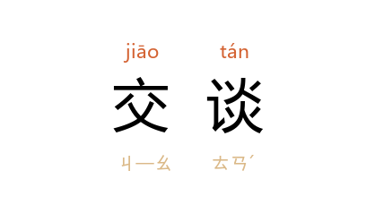 引宋 宋敏求 《春明退朝录》卷中:“文僖 戏为句曰:‘正好睡时行十里,不交谈处饮三杯。’”《二十年目睹之怪现状》第二一回:“那就男女之间,永远没有交谈的时候了。”茅盾 《子夜》十五:“在厂门右侧,却是那 钱葆生 和一个巡长模样的人在那里交谈。”