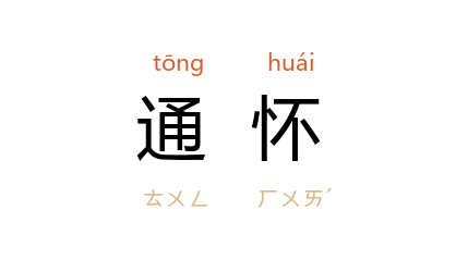 引《宋书·南郡王义宣传》:“师护 虽无殊绩,洁己节用,通怀期物,不恣羣下。”《资治通鉴·唐高宗武德元年》:“今日以前,咸共刷荡,使至以后,彼此通怀。”清 梅曾亮 《闲园诗》序:“下不能径达其情於上,上不能明示其意,惟郡守之职当其枢,可以通怀虑微,抒德导情。”