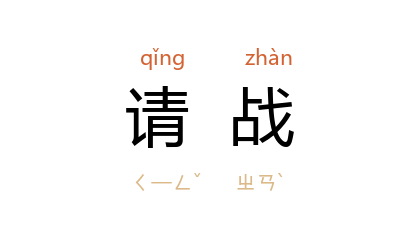 引汉 赵晔 《吴越春秋·勾践伐吴外传》:“国人请战者三年矣。”李志民 《奇兵致胜》:“个个情绪高涨,请战的要求不断地一级级传上来。”《人民日报》1975.7.14:“登山队决定向上级‘请战’,把一九七六年再次攀登 珠穆朗玛峰 的任务提前一年完成。”徐迟 《哥德巴赫猜想·生命之树常绿》:“他用坚定的声音请战:‘我去!’”
