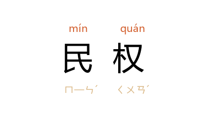 廖仲恺 《革命继续的工夫》:“民权这两个字的解释,在政治上说,就是人民有参预立法、容喙政治的权;在法律上说,就是人民有不许别人侵犯他的身体、言论、信仰、住居、集会种种自由的权。”
