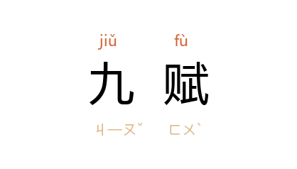 按,前六种赋税皆以地区远近为区别,征土地产物;关市之赋征商旅税;山泽之税征矿、渔、林业税;币馀之赋指不属以上各类的其他赋税。后以“九赋”泛指各类赋税。 南朝 宋 鲍照 《喜雨奉勅作》诗:“关市欣九赋,仓廩开万箱。”