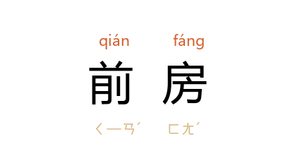 ⒈ 旧称先娶之妻。滇剧《闯宫》:“我就是你驸马公的前房夫人到了!”庭院最前面的房屋。
