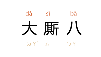引元 无名氏 《百花亭》第一折:“自笑我有那 崔护 诗才几些,怎敢便大厮八将凉浆謁。”元 无名氏 《货郎旦》第二折:“畅道你父亲此地身亡,你是必牢记着这日头,大厮八做箇週年。”