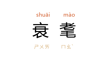 引汉 刘向 《九叹·逢纷》:“颜霉黧以沮败兮,精越裂而衰耄。”《资治通鉴·陈宣帝太建十二年》:“迥 末年衰耄,及起兵,以小御正 崔达拏 为长史。”胡三省 注:“《记》,五十始衰;谓精力消耗。八十、九十曰耄。注:耄,惛忘也。”明 高明 《琵琶记·书馆悲逢》:“早知你形衰耄,怎留圣朝?”《东周列国志》第三二回:“﹝ 齐桓公 ﹞到今日衰耄之年,志气自然昏惰了。”