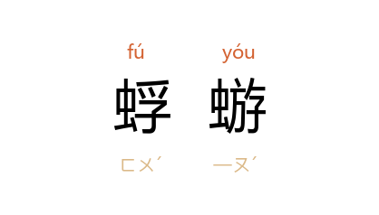 ⒈ 动物名。虫类。长六、七分,头似蜻蛉而略小,有四翅,体细而狭。夏秋之交,多近水而飞,往往数小时即死。也作「浮游」、「浮蝣」。