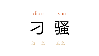 ⒈ 头发短而乱。元·狄君厚〈夜行船·忆昔扬州套·新水令〉曲:「别来双鬓已刁骚,绮罗丛梦中频到。」元·无名氏也作「刁萧」、「刁搔」、「凋疏」、「雕骚」、「雕飕」。