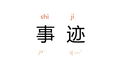 ⒈ 事情发展经过的遗迹。亦指人生的经历及所做的种种事情。宋·欧阳修〈五代史记一行传叙〉:「然其事迹不著,而无可纪次。」也作「事迹」、「事踪」。
