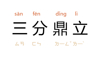 ⒈ 比喻三方势力均等、共存的局面。参见「鼎足而立」条。