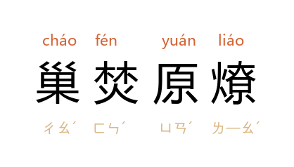 引《文选·左思<魏都赋>》:“姦回内贔,兵缠紫微,翼翼京室,眈眈帝宇,巢焚原燎,变为煨烬,故荆棘旅庭。”张载 注:“董卓 迁都 长安,其夜烧 洛阳 南北宫。 《易》曰:‘鸟焚其巢。’《尚书》曰:‘若火之燎于原。’”清 侯方域 《定鼎说》:“自 英皇 北狩, 河套 沦没,巢焚原燎,麋鹿为墟。”