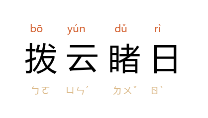 ⒈ 拨开云雾见太阳。语本后以此语形容受到启发,豁然开通的心情。或比喻一扫阴霾,见到光明、希望无穷的境遇。元·王实甫也作「拨云见日」。