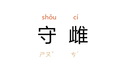 引《老子》:“知其雄,守其雌,为天下谿。”吴澄 注:“雄,谓刚强;雌,谓柔弱。”晋 葛洪 《抱朴子·至理》:“涤除玄览,守雌抱一。”清 龚自珍 《释言》诗之一:“守默守雌容努力,毋劳上相损宵眠。”鲁迅 《坟·文化偏至论》:“夫安弱守雌,篤於旧习,固无以争存於天下。”