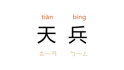 英语celestial soldier, (old) imperial troops, (Tw, jocular) clumsy army recruit, (more generally) bungler, screw-up