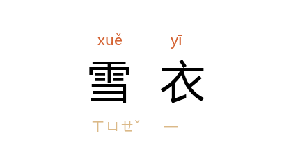 ⒊ 泛指某些白色的鸟类。(1)白鹭。宋苏轼《新年》诗之二:“北渚集群鹭,新年何所之……何当禁毕弋,看引雪衣儿。”宋范成大《题〈秋鹭图〉》诗:“一江秋色无人问,尽属风标两雪衣。”(2)鸽。宋苏轼《常润道中有怀钱塘寄述古》诗之二:“去年柳絮飞时节,记得金笼放雪衣。”自注:“杭人以放鸽为太守寿。”