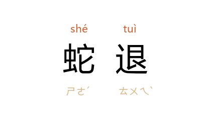 引宋 黄庭坚 《上南陵坡》诗:“风飡水宿六千里,蛇退猿啼百八盘。”宋 陆游 《兀坐颇念游历山水戏作》诗:“鬼愁滩下扁舟晚,蛇退陂前古驛寒。”明 徐弘祖 《徐霞客游记·江右游日记》:“昏黑无所见,乃蛇退而出。”