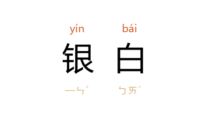 引王西彦 《鱼鬼》三:“她那银白的长发披散在瘦削的两肩。”茹志鹃 《高高的白杨树·澄河边上》:“他真想立即看见那条河,一条银白色的河。”