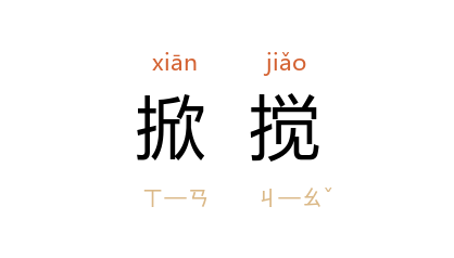 引唐 陆龟蒙 《奉和袭美苦雨见寄》:“惯曾掀搅大笔多,为我才情也如此。”宋 苏舜钦 《奉酬公素学士见招之作》诗:“近罹罪辱舌虽在,每避嫌谤口已胶。更连掀搅岂不畏,欲取笔砚俱焚烧。”宋 苏轼 《与王元直书》:“某为权倖所疾久矣,然捃摭无获,徒劳掀搅,取笑四方耳。”