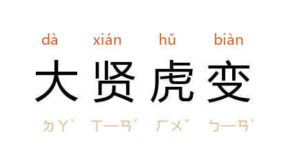 ⒈ 虎变,老虎身上的斑纹变化多彩。大贤虎变比喻居上位者的向善去恶,以显现其德行之美。亦比喻由贫贱而变显达。唐·李白〈梁甫吟〉:「大贤虎变愚不测,当年颇似寻常人。」也作「大人虎变」。