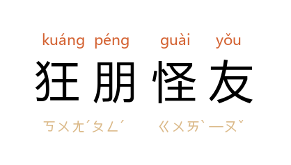 ⒈ 性格狂放古怪的朋友。元·白贲〈醉花阴·良夜恹恹套·六么令〉曲:「恋酒迷歌,狂朋怪友出门多,是他无明夜纵心儿宴乐。」元·杨文奎也作「怪友狂朋」。