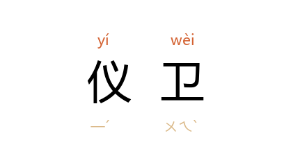 引《魏书·李元护传》:“若丧过 东阳,不可不好设仪衞,哭泣尽哀,令观者改容也。”前蜀 杜光庭 《宣再往青城安复真灵醮词》:“仰堂宇之威容,覩四垣之仪衞。”《宋史·仪卫志一》:“徽宗 政和 三年,议礼局上 大庆殿 大朝会仪衞。”清 戴名世 《孑遗录》:“史可法 以父丧归,继 可法 者为 郑二阳。二阳 行军,仪衞甚盛。”