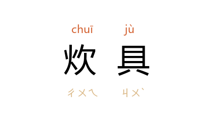 ⒈ 烹饪用的器具。如锅、炉、铲、勺等。