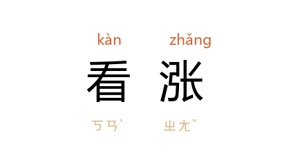 引曹禺 《日出》第二幕:“李 :‘您自然是看涨。’ 潘 :‘我买进,难道我会看落?’”许杰 《一个人的独白》:“什么都可囤积,什么都可看涨,但我们的商品--你爸爸是用智识来当商品出卖的商人--却是愈来愈跌价,愈来愈不值钱。”